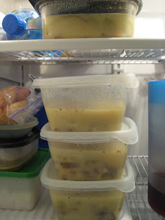 I made potato soup for dinner tonight and we had plenty of leftovers, as you can see. I got two different recipes from two different friends and couldn't decide which one I liked better, so I combined certain parts of each of them. Next time I'll have to add less water, but this did have a very nice taste anyway. I was also very pleased that Justin loved it. :)